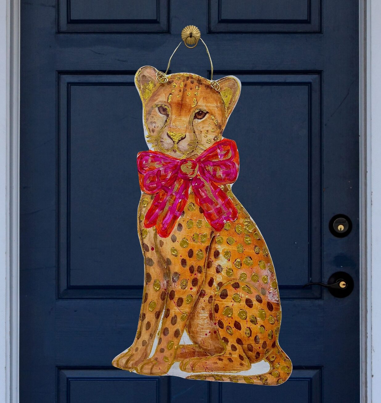 A Chinoiserie Cheetah with a regal statute, flamboyant bow and lots of gold! Stunning for a door or inside!