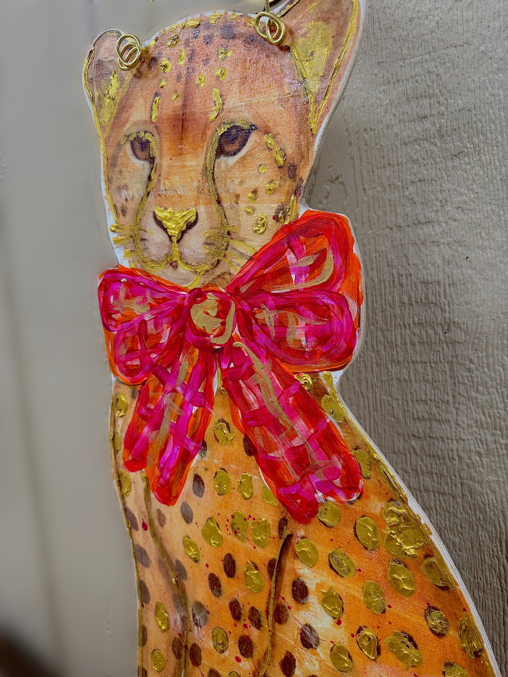 A Chinoiserie Cheetah with a statue-regal, flamboyant bow and lots of gold!