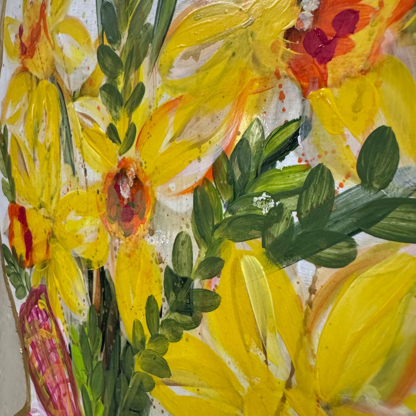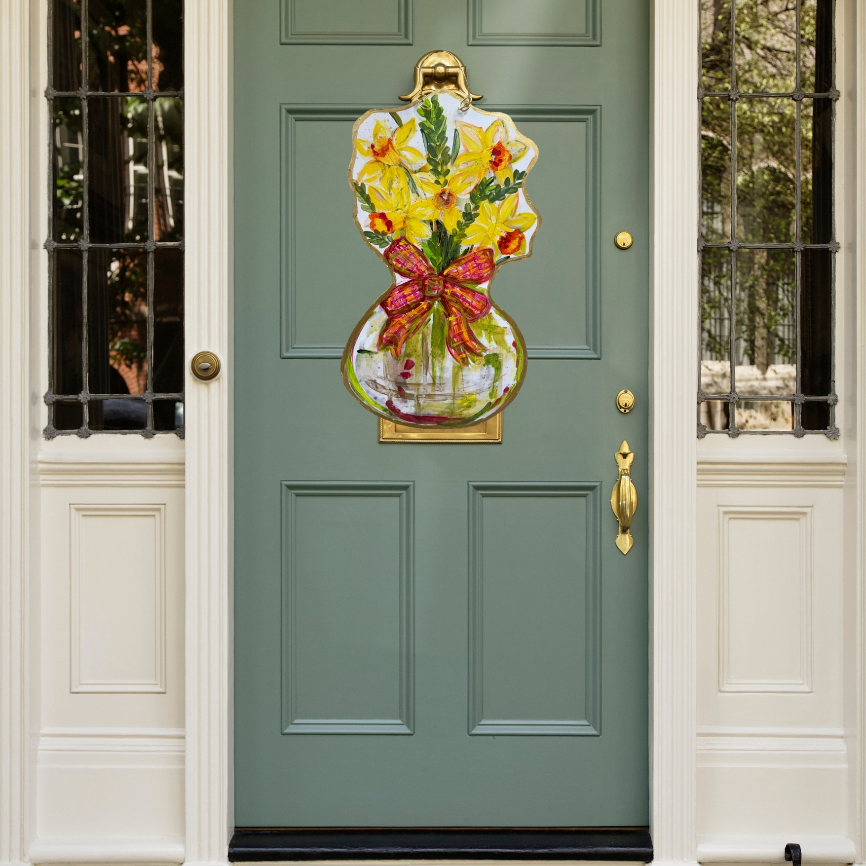 We knew spring was here when the daffodils bloomed in Mammy’s (Big Mary Julia’s) yard. Decorate any space inside or outside your home with this beautiful glass vase filled with the most radiant daffodils- perfected with a big pink bow!