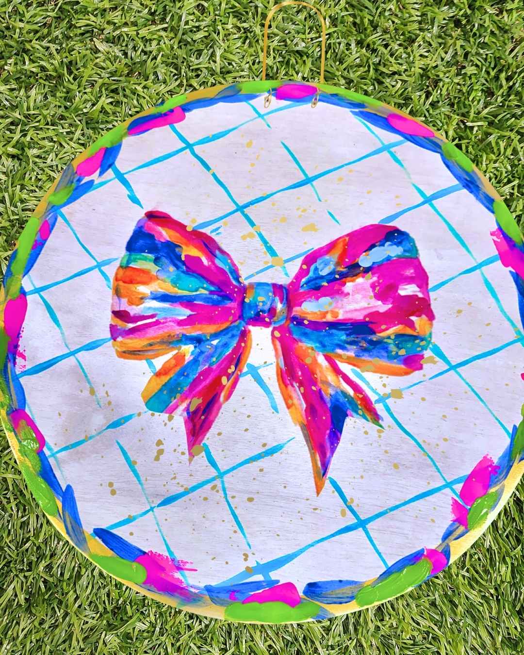 Bright Acrylic bow on a 22 inch round. Customize with the bible verse John 14:1 !