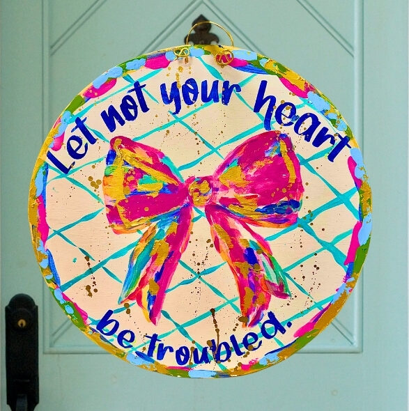 A bow reminds us of the sweet simple gifts we have in our lives. Perfect for a baby gift, front door or child’s room. Comes in two versions- this version comes with a bible verse from John 14:1.